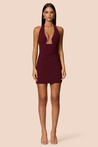 The all-time favourite Nookie neckline paired with a long column skirt and back split. Features wide halter straps and body skimming fit, boning at side bust and an invisible zip at back with rose gold Nookie puller. Fully lined.