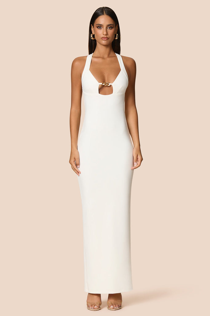 Classic Nookie silhouette with striking two-way neckline. Gold chain at front. Invisible zip and split at back. Fully lined.