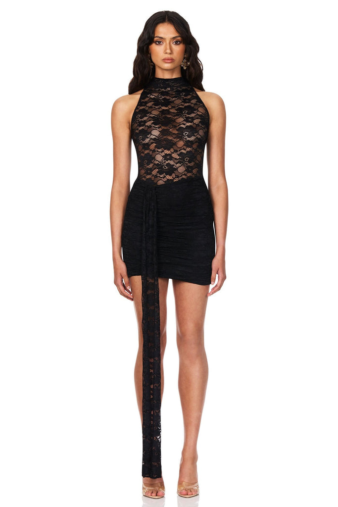 Striking high neck stretch lace mini dress with semi-sheer bodice, ruched skirt and long lace tie from waist. Invisible zipper at centre back. Crafted from a floral stretch lace, skirt is lined.