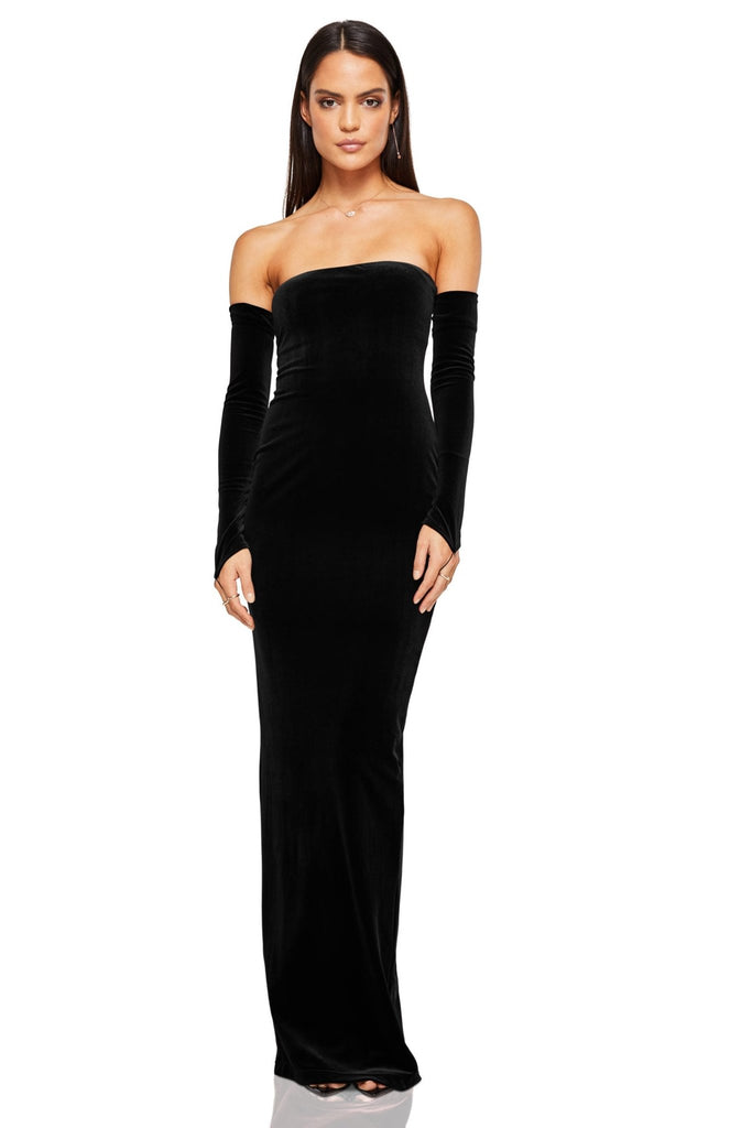Show-stopping strapless gown with stunning detached sleeves. Crafted from luxe velvet, with a low back & split. Fully lined.