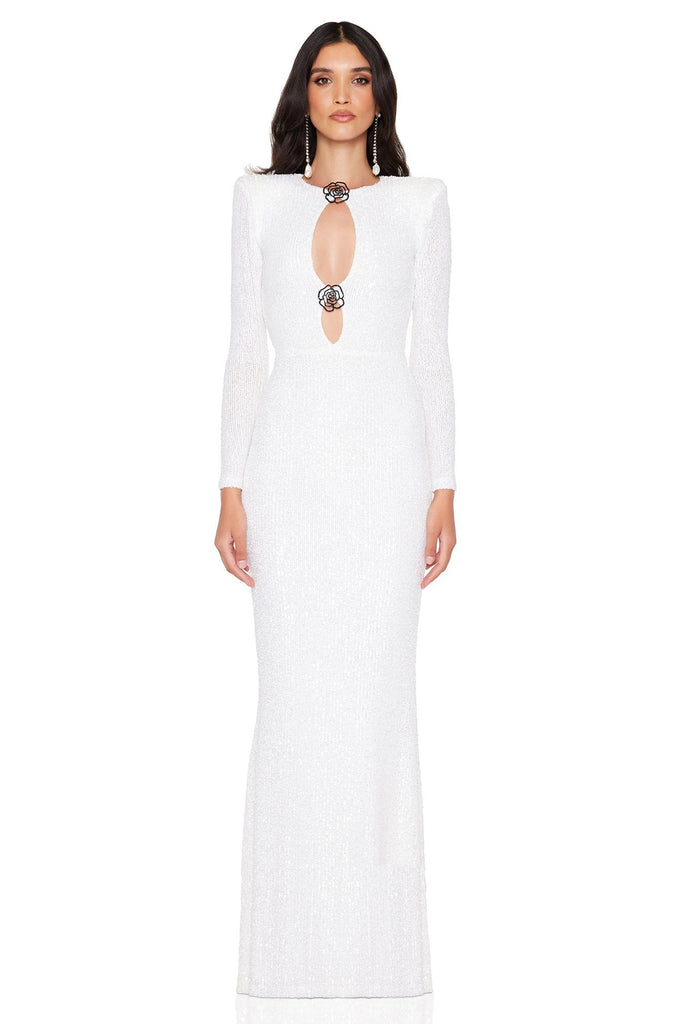 Radiate elegance with this opulent floor length design. Features a two-tiered cut-out element adorned with luxe floral pins, a long sleeve and sexy high side split. Fully lined.