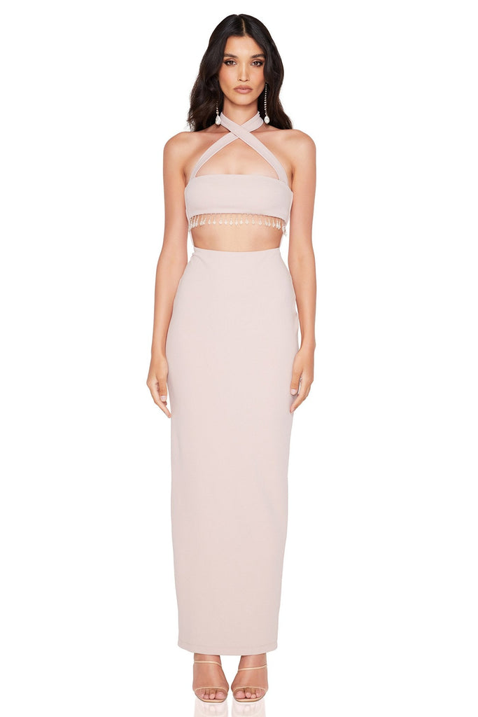 Sophisticated halter midi crafted from our signature stretch scuba crepe. Features a striking cut-out at detail at the centre waist lined with luxe crystal beading and a split at the back hem for ease of wear.