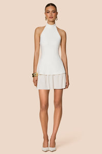A modern romantic. The Alessia Mini in stretch lace is a stunning off-shoulder bodycon with long sleeves and scalloped edges. Designed to contour the body with side boning and skin tone power mesh lining. Centre back zipper with rose gold logo zipper head.