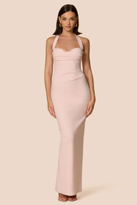 Daring maxi designed to have all eyes on you. Crafted from our signature blend of classic scuba crepe and luxe mesh, this incredible style features a fitted bodysuit full lining with a split at the back hem for ease of wear.