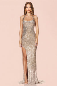 Glittering floor length gown crafted from our luxe stretch sequin. Features a deep V neckline with a structured bodice, sculpted underwire under the bust & thigh high split. Fully lined, buttons at neck and invisible zip at back waist.