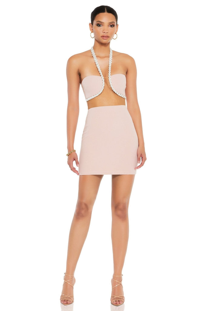 Enchanting halter mini dress with a gorgeous beaded trim, sheer mesh cut-out & exposed midriff. Cut from our signature scuba crepe with a nipped waist for an immaculate fit.