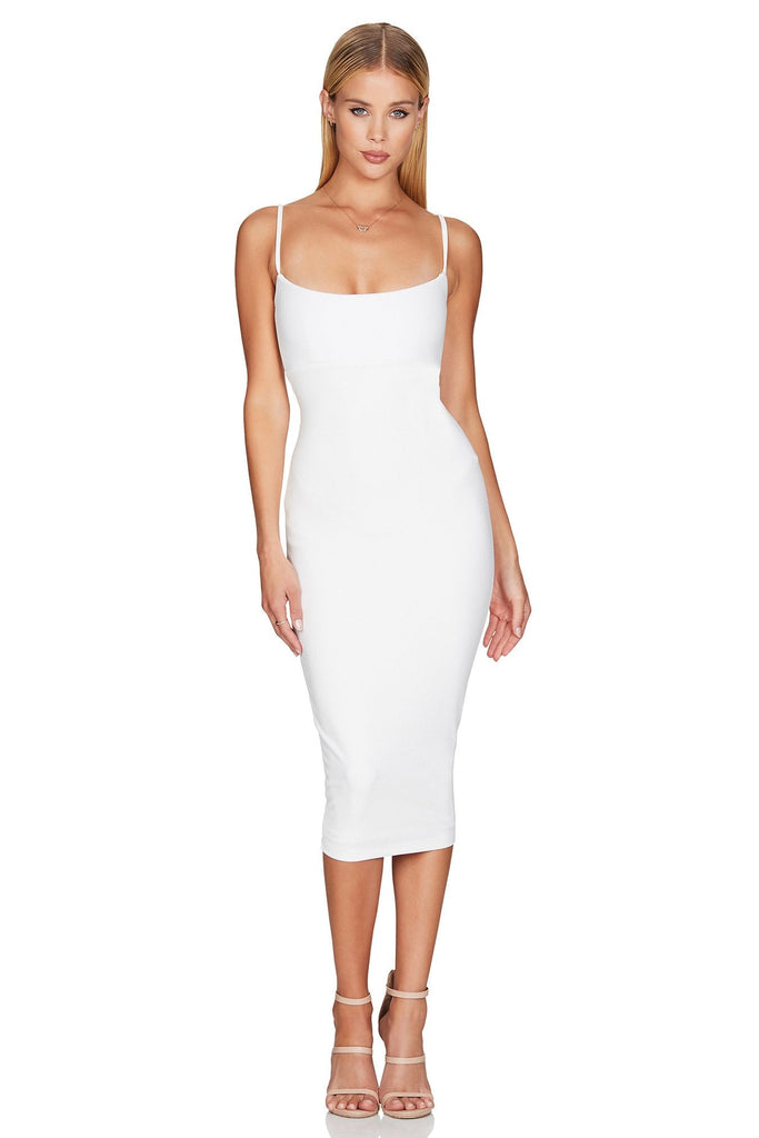 Classic midi dress, made from our signature form fitting scuba crepe. Fully lined with padded bra cups. Invisible zipper at centre back and adjustable straps. Rose gold accessories.