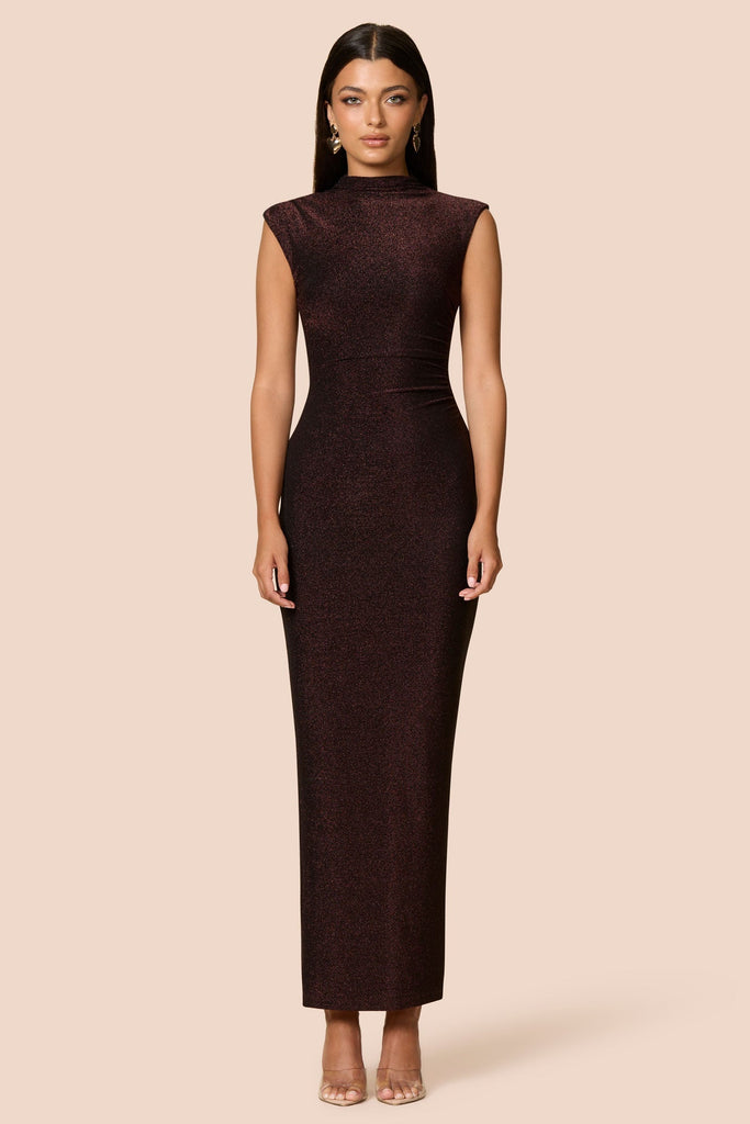 Sophisticated high neck maxi with subtle gather at side waist and shoulder. Invisible zip at back and split at hem. Fully lined.