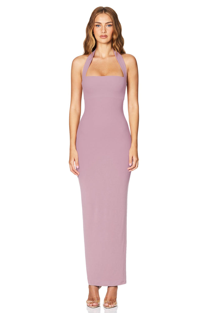 The all-time favourite Nookie neckline paired with a long column skirt and back split. Features wide halter straps and body skimming fit, boning at side bust and an invisible zip at back with rose gold Nookie puller. Fully lined.