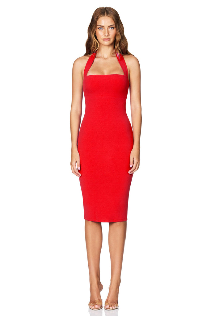 Figure hugging bodycon crafted from our signature stretch scuba crepe. Features a halter neck fit with wide supportive straps. Fully lined with invisible zip closure at centre back.