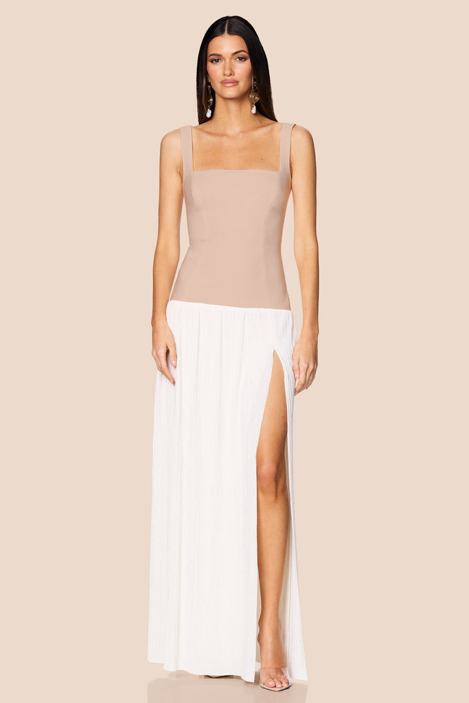 Statement staple maxi dress with classic Nookie square neckline. Bodice is crafted in a stretch bonded crepe, the skirt is a soft pleated jersey. Invisible zip at back. Bodice is lined.