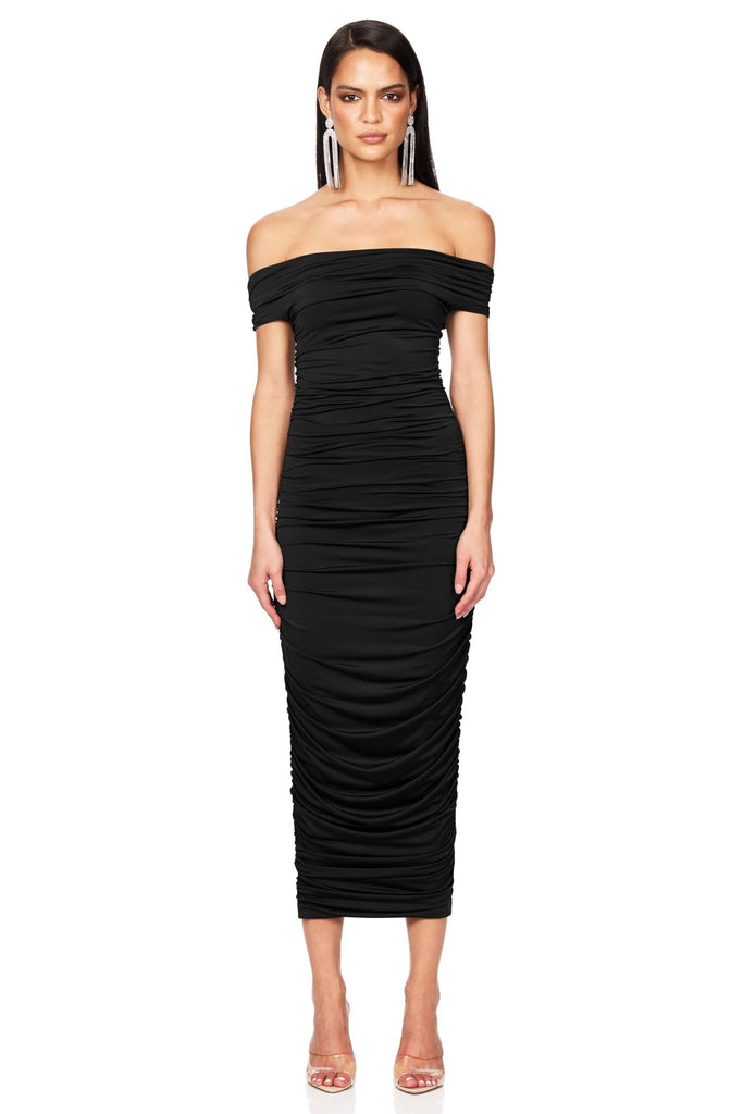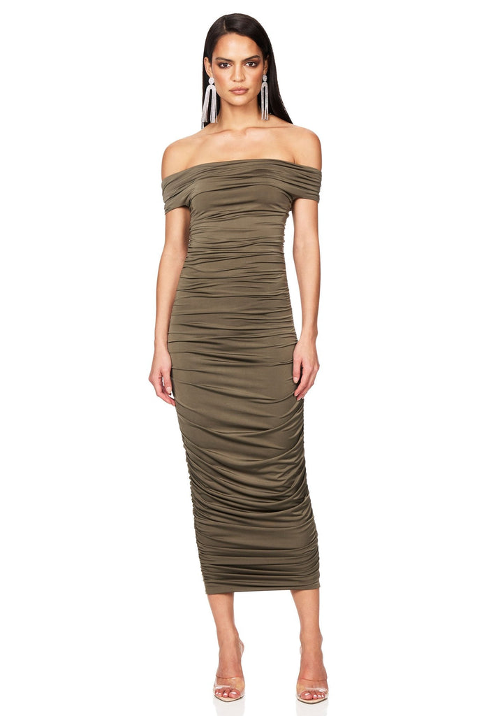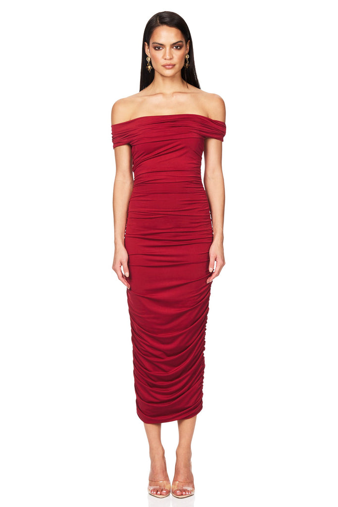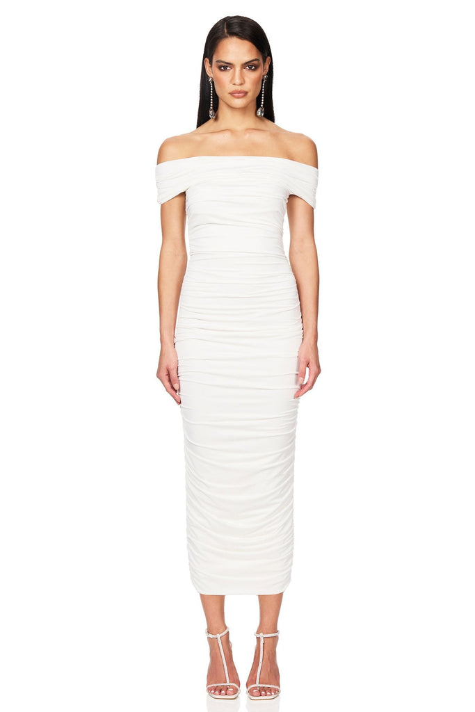 Elegant midi dress crafted from a delicately ruched jersey. Features a body-hugging silhouette, stunning off-shoulder fit and an invisible zip closure at the centre back.