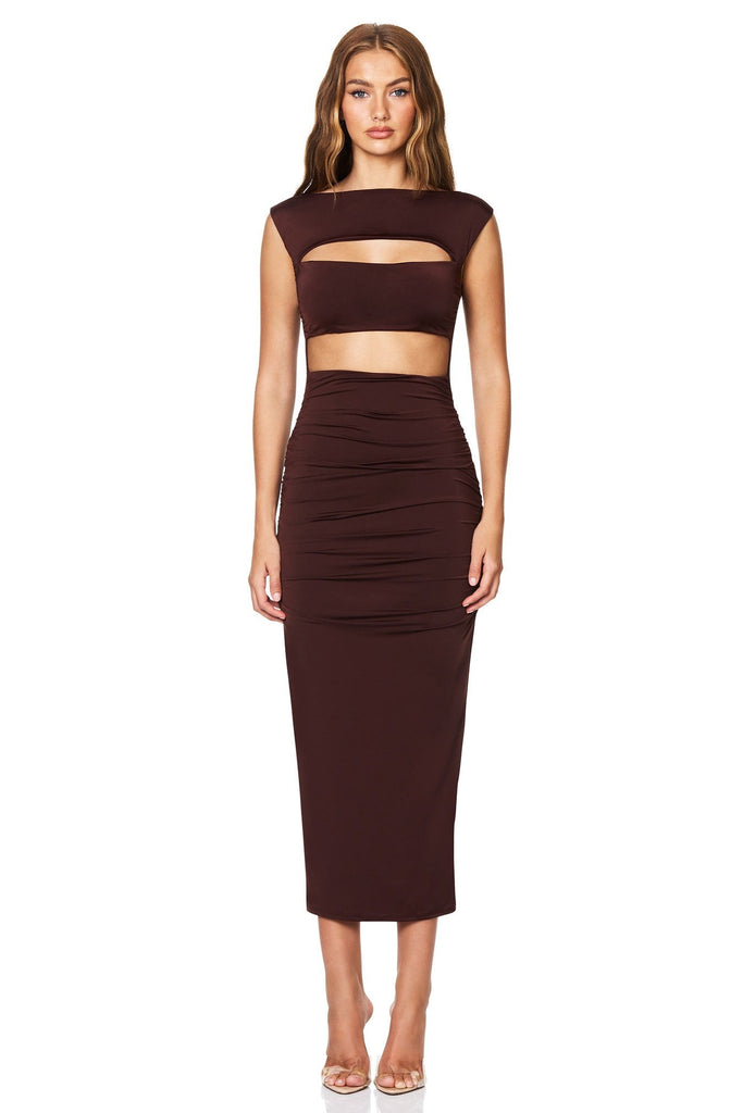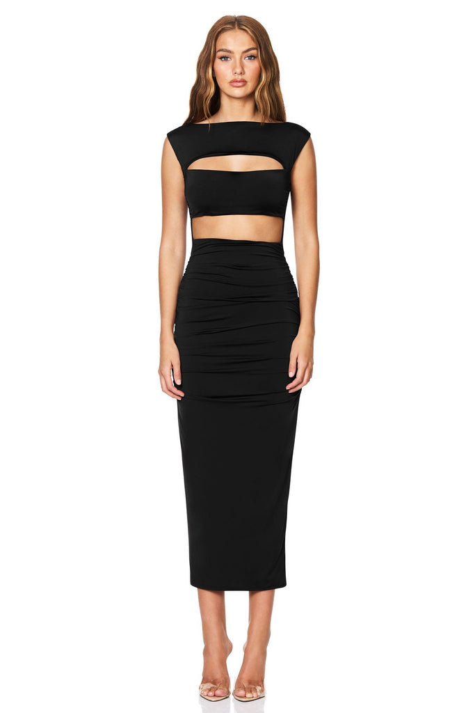 Must-have midi cut from our slinky jersey. Features striking cut-out details, body-hugging ruching & a split at the back hem for easy wear.