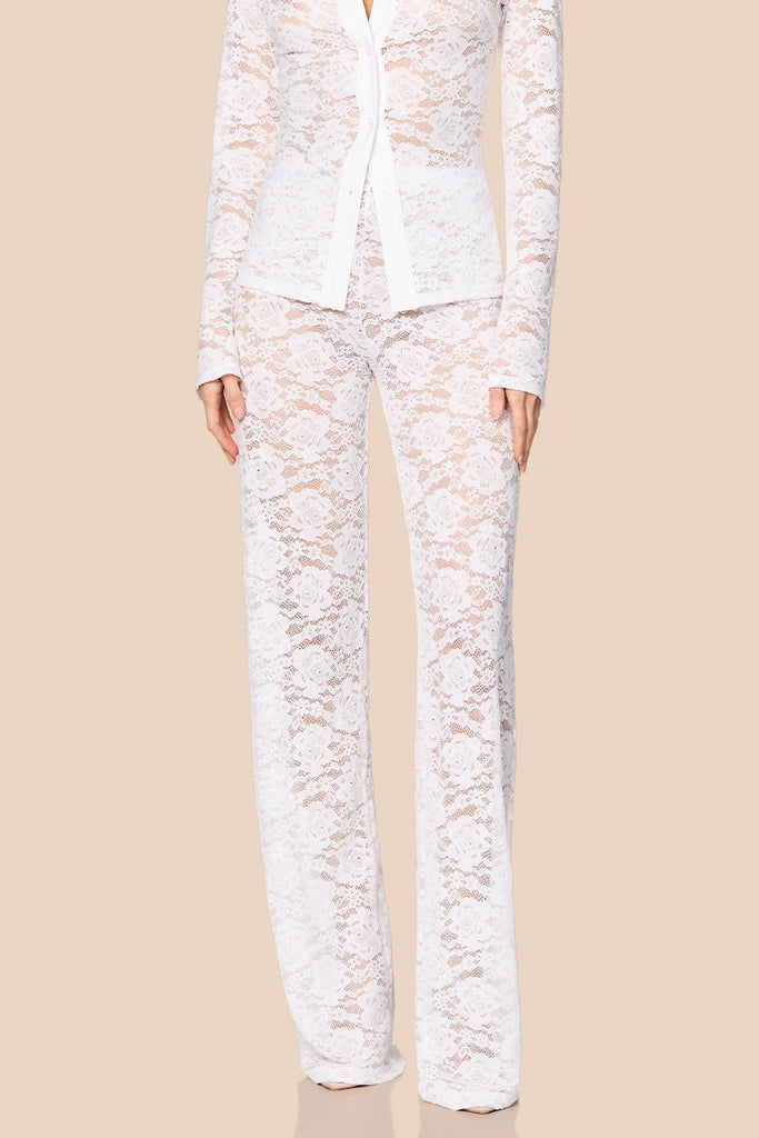 Incredible high-waisted sheer lace pant with nude brief. Straight, wide leg, full length.