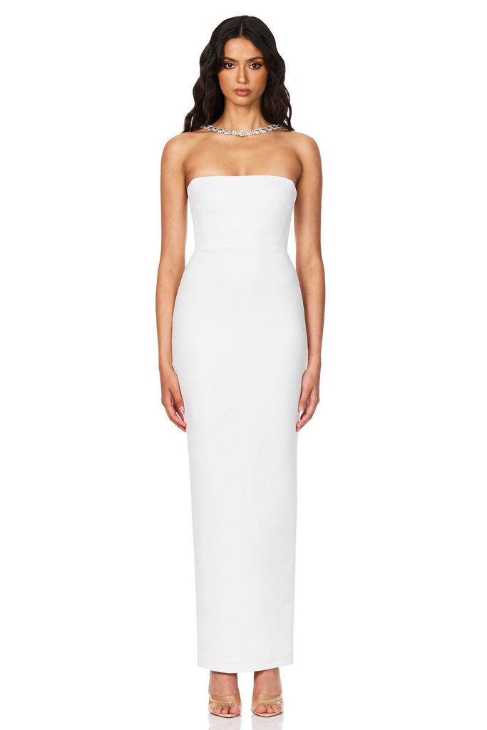 Timeless strapless column gown with elegant crystal strap along the front neck. Crystal strap is removable. Crafted in our signature stretch crepe, with structured bodice underneath and split at back hem. Invisible zip closure at back, fully lined.