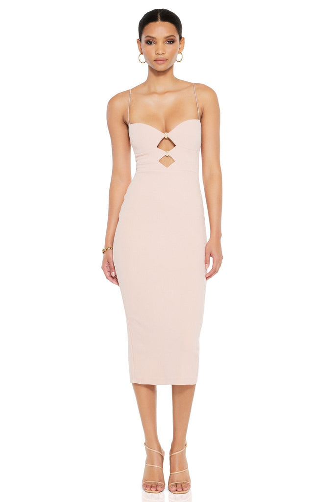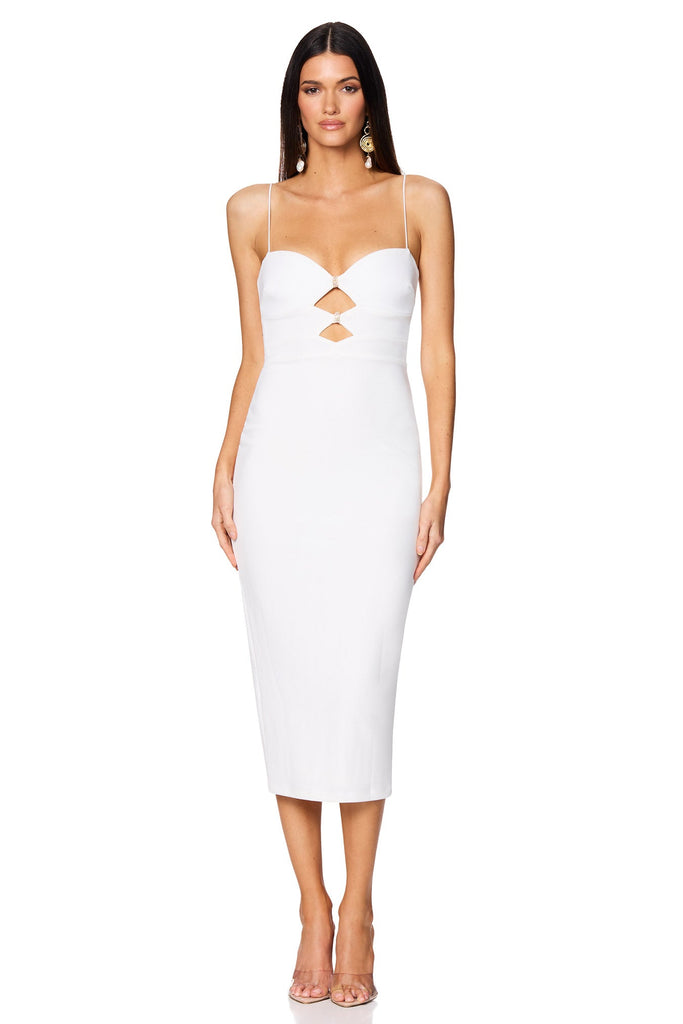 Move from one event to the next with ease in this gorgeous midi dress. Designed in our luxe scuba crepe with flirty cut-outs, diamante details & a sweetheart neckline.