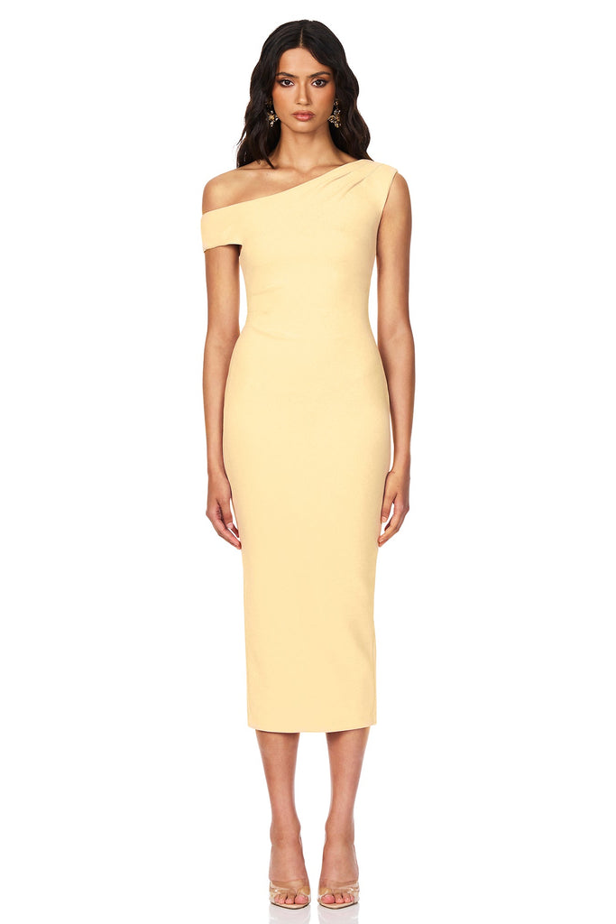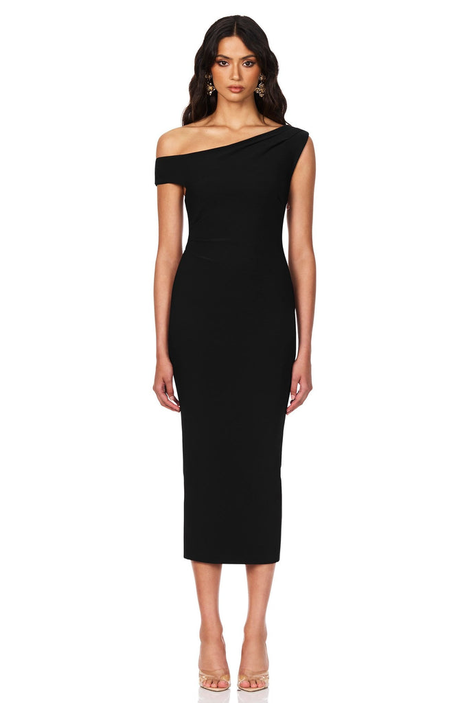 Elegant off shoulder midi with slim silhouette, and flattering tucks at shoulder and waist. Perfectly fitted with split at back hem and an invisible zip opening at side seam. Crafted in a stretch bonded crepe fabrication, fully lined.