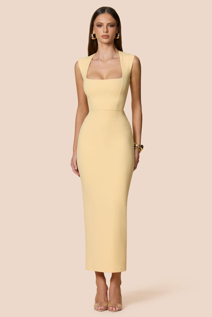Beautiful midi with striking neckline, natched waist and the perfect long length. Crafted in our signature bonded crepe, with invisible zip at neck and split at back hem. Fully lined.