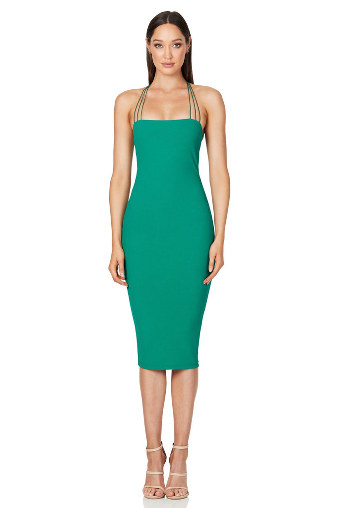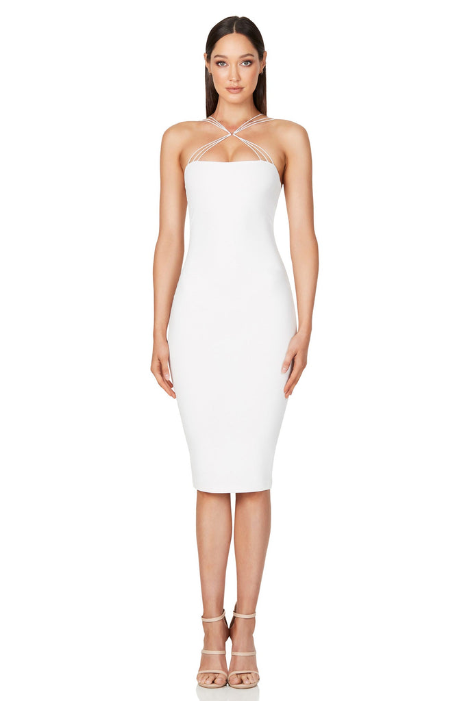 Timeless midi dress crafted from our form fitting scuba crepe. Features fine elastic straps that can be worn two ways: cross-front with gold link at collarbone or crossed over at the back. Fully lined.