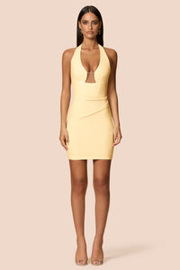 Flirtatious and fresh. The Darling Mini combines clean lines with a soft pleated hem for playful movement. A bonded crepe halter bodice with side boning and pleated mini. Back neck closure with covered buttons and CB logo zipper.