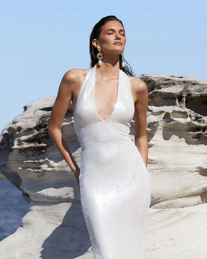 Make a statement with this plunging floor length design. Crafted from our form-fitting scuba crepe with a structured bodice, sculpted underwire under the bust & thigh high split. Fully lined, buttons at neck and invisible zip at back waist.