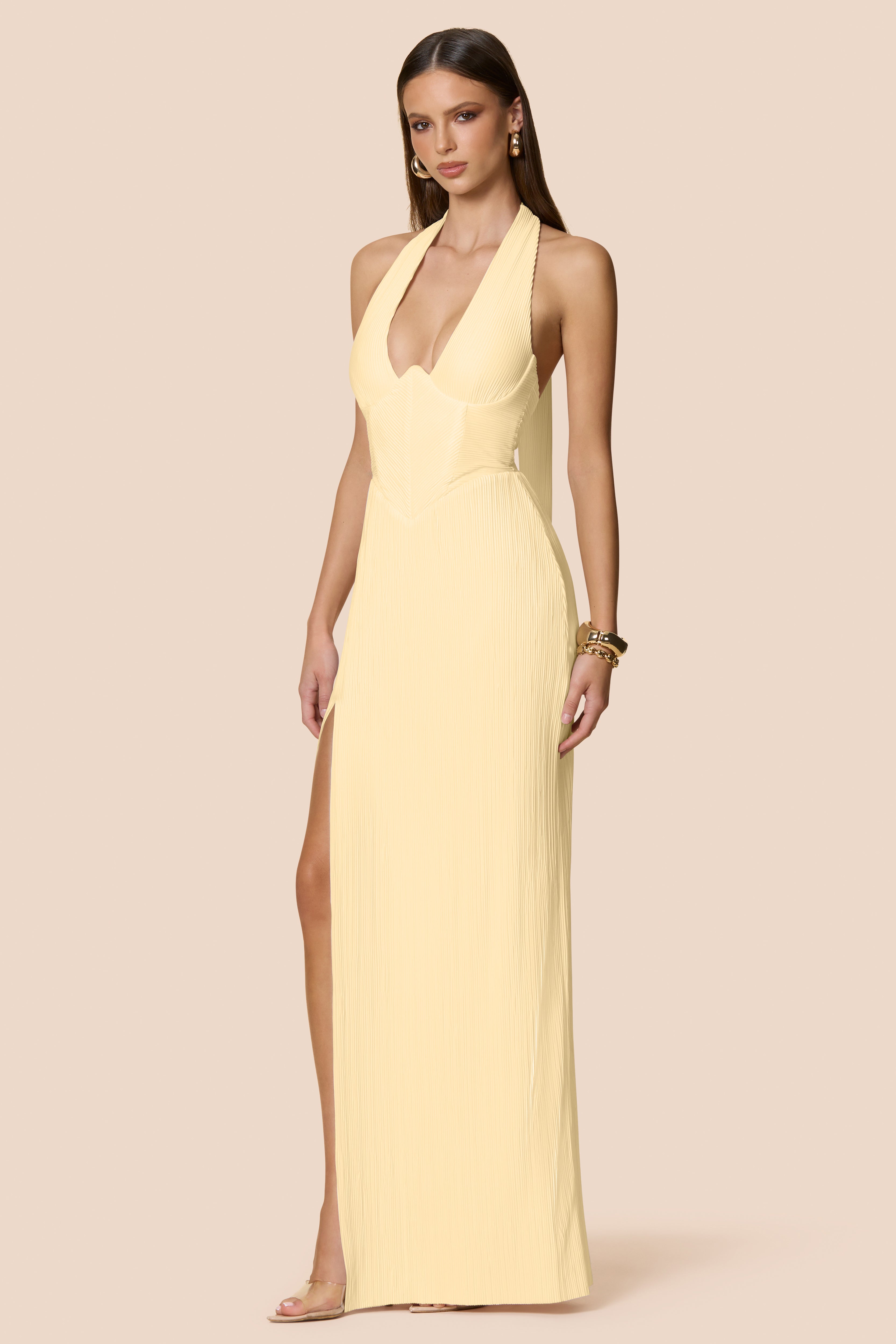 Flirtatious and fresh. The Darling Mini combines clean lines with a soft pleated hem for playful movement. A bonded crepe halter bodice with side boning and pleated mini. Back neck closure with covered buttons and CB logo zipper.