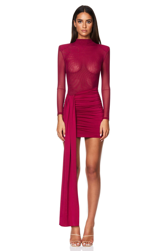 Make it a moment to remember with soft draping & an unforgettable silhouette. Crafted from a combination of our signature stretch mesh and slinky jersey, this long sleeve mini features an ultra-high neck & flattering ruched skirt and long waist tie in slinky jersey. Invisible closure at back.
