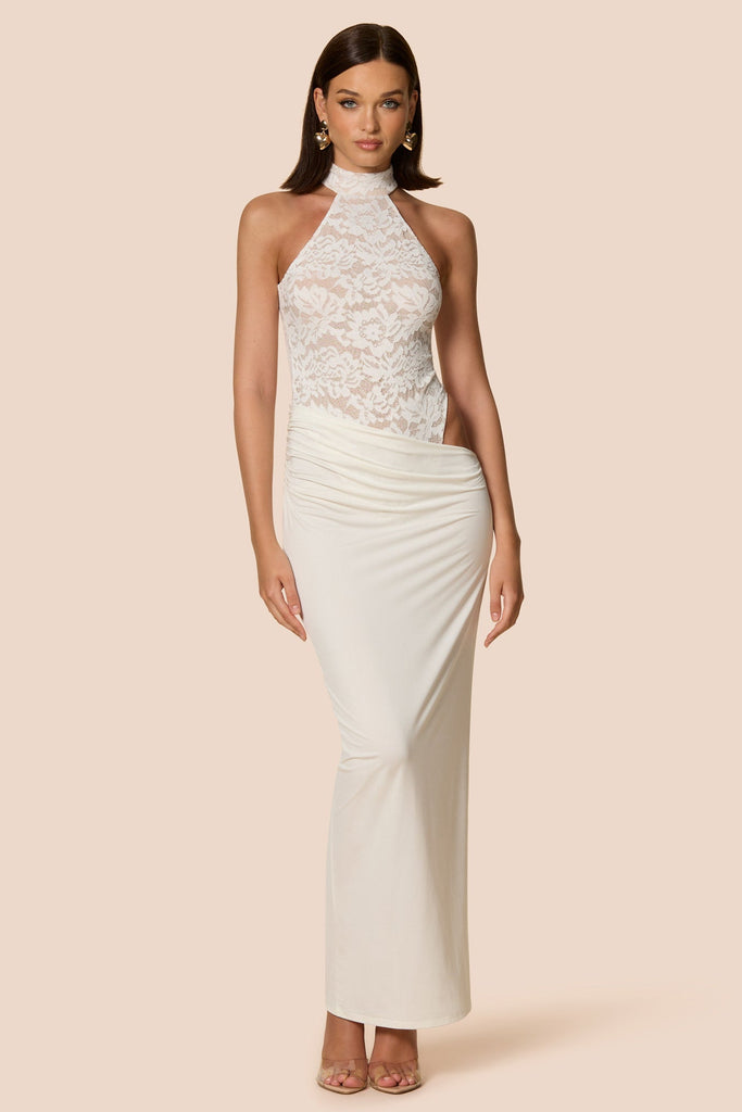 Incredible halter gown, with a sheer lace bodysuit and slinky jersey skirt drape from one side. Exposed hip. Invisible zip at back and snap closure at pant. Bodysuit is lined.