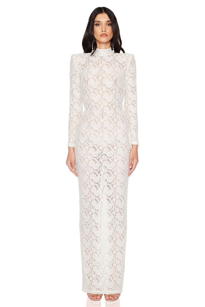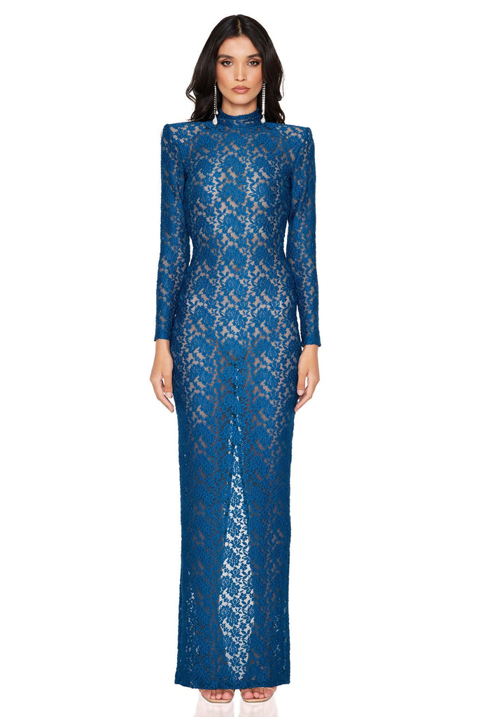 Make an impact with our head-turning Roxana LS Gown. Made from a stunning textured lace with a high neck collar and visible shoulder pads. Fully sheer with a split in the back hem and invisible zip closure at the centre back.