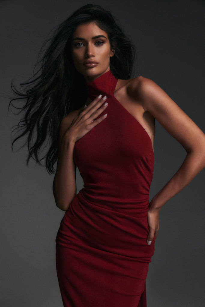 Effortless high neck gown designed for every occasion. Featuring a low back and extra long tie, this dress will be an instant classic. Crafted in a textured knit with subtle shimmer and fully lined for that perfect Nookie fit.