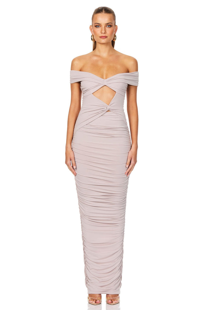 Gorgeous off shoulder maxi dress with gathered bra, twist at side waist, gather down the sides and split at centre back hem. Cut out detail at front midriff, invisible zip closure at back. Crafted in our signature super soft jersey, fully lined.