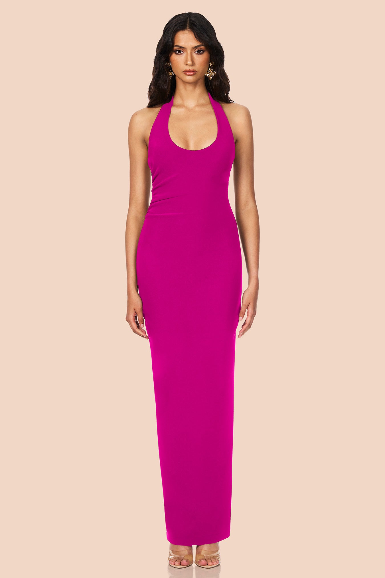 Glistening floor length gown crafted from our shimmering striped sequin. Features a nipped waist, low back & stunning side split. Fully lined.