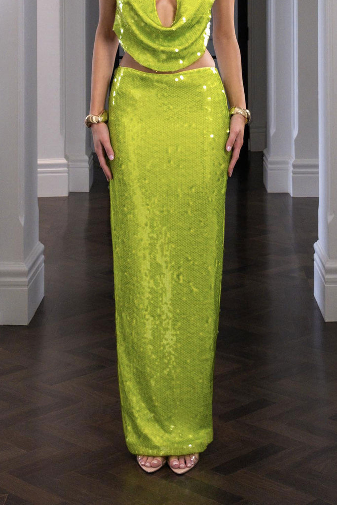 Low slung sequin skirt with column silhouette and split at back hem. Invisible zip at back waist. Crafted in a clear sequin on vibrant stretch base. Fully lined.