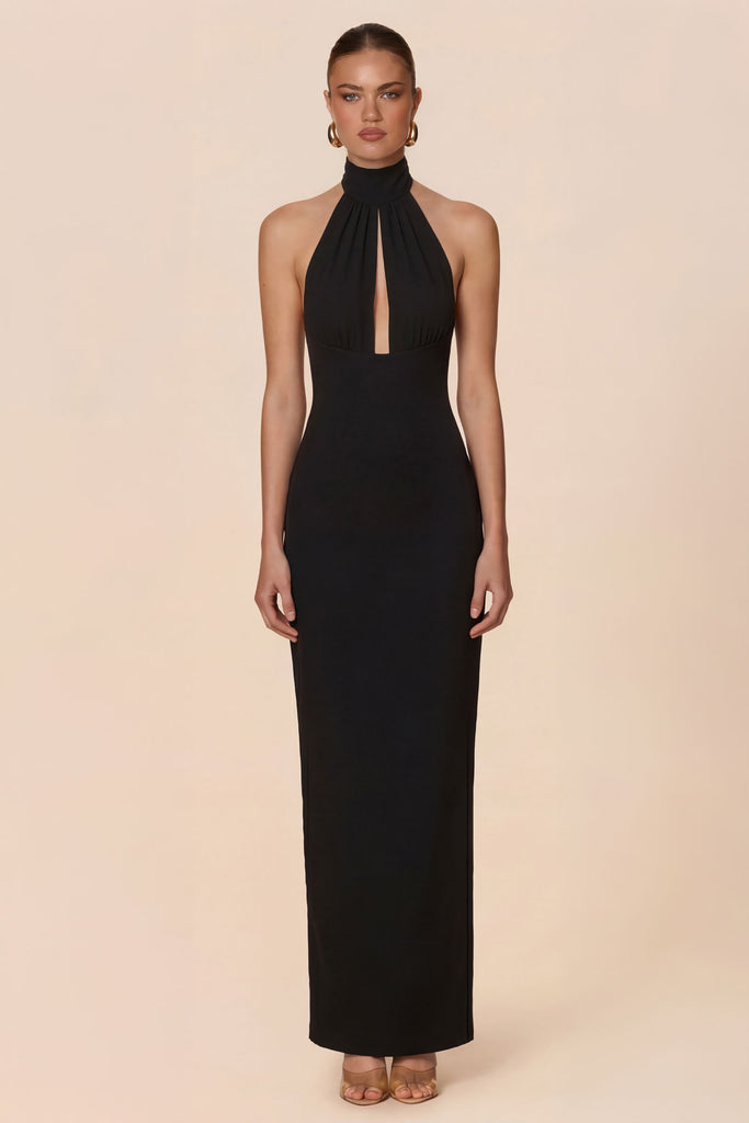 Made for the spotlight—The Martini Halter Gown is a sleek silhouette with sheer mesh halter with keyhole cutout and bust inserts. Neck closure with covered buttons and sheer scarf ties. She’s daring, divine, and chic.