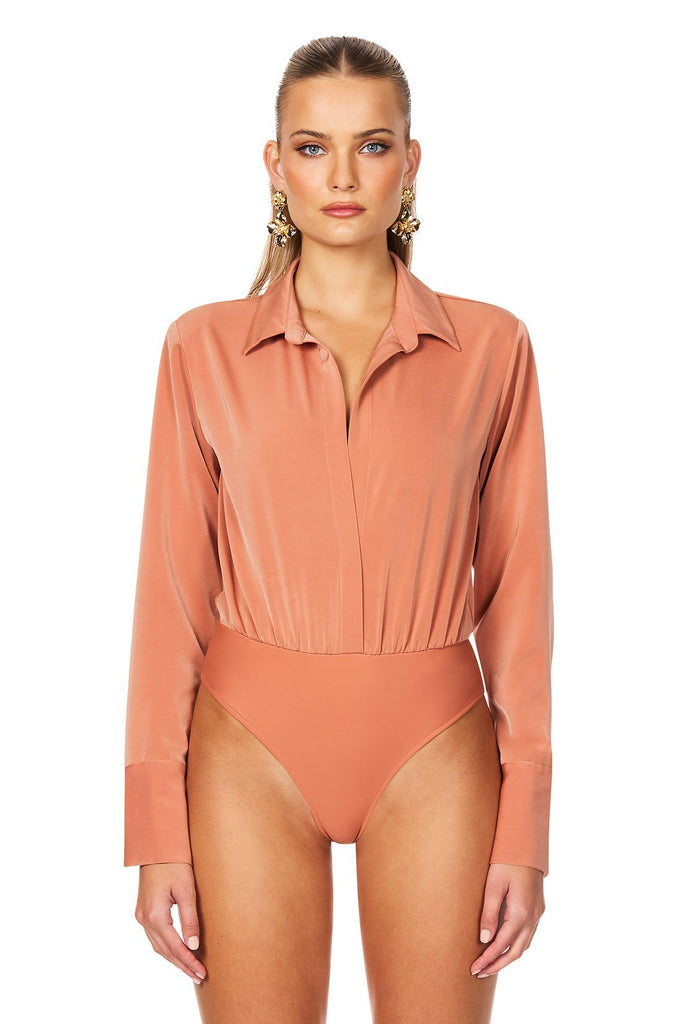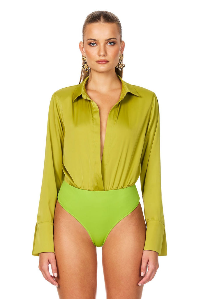 Sleek satin shirt bodysuit featuring a plunging neckline with 2 invisible press studs and elongated cuffs. G-string pant is cut in our super soft jersey fabrication.
