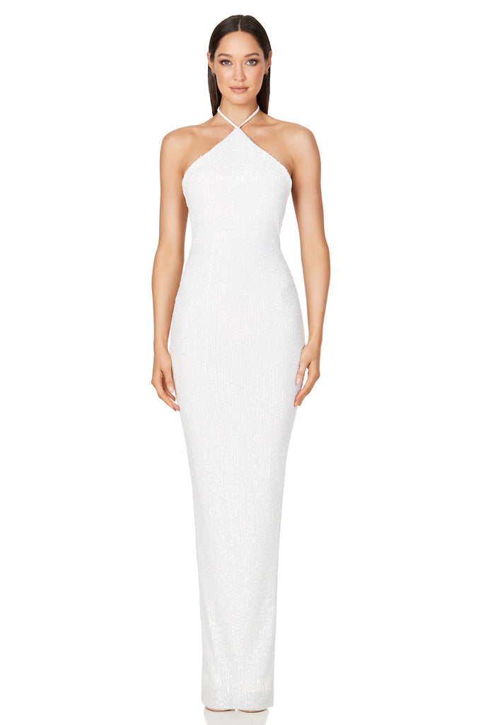 Sophisticated halter gown with a high neck, flattering column silhouette & stunning low back. Crafted from our glittering sequin, fully lined.