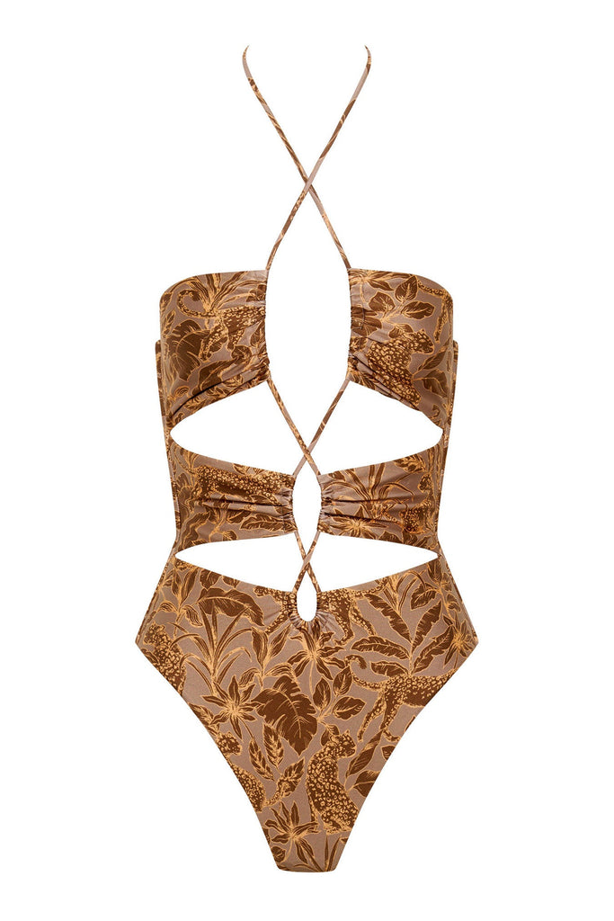 Turn heads in this sexy full piece number. Crafted from a gorgeous tropical print with a halter tie, flattering ruching and striking cut-out details.